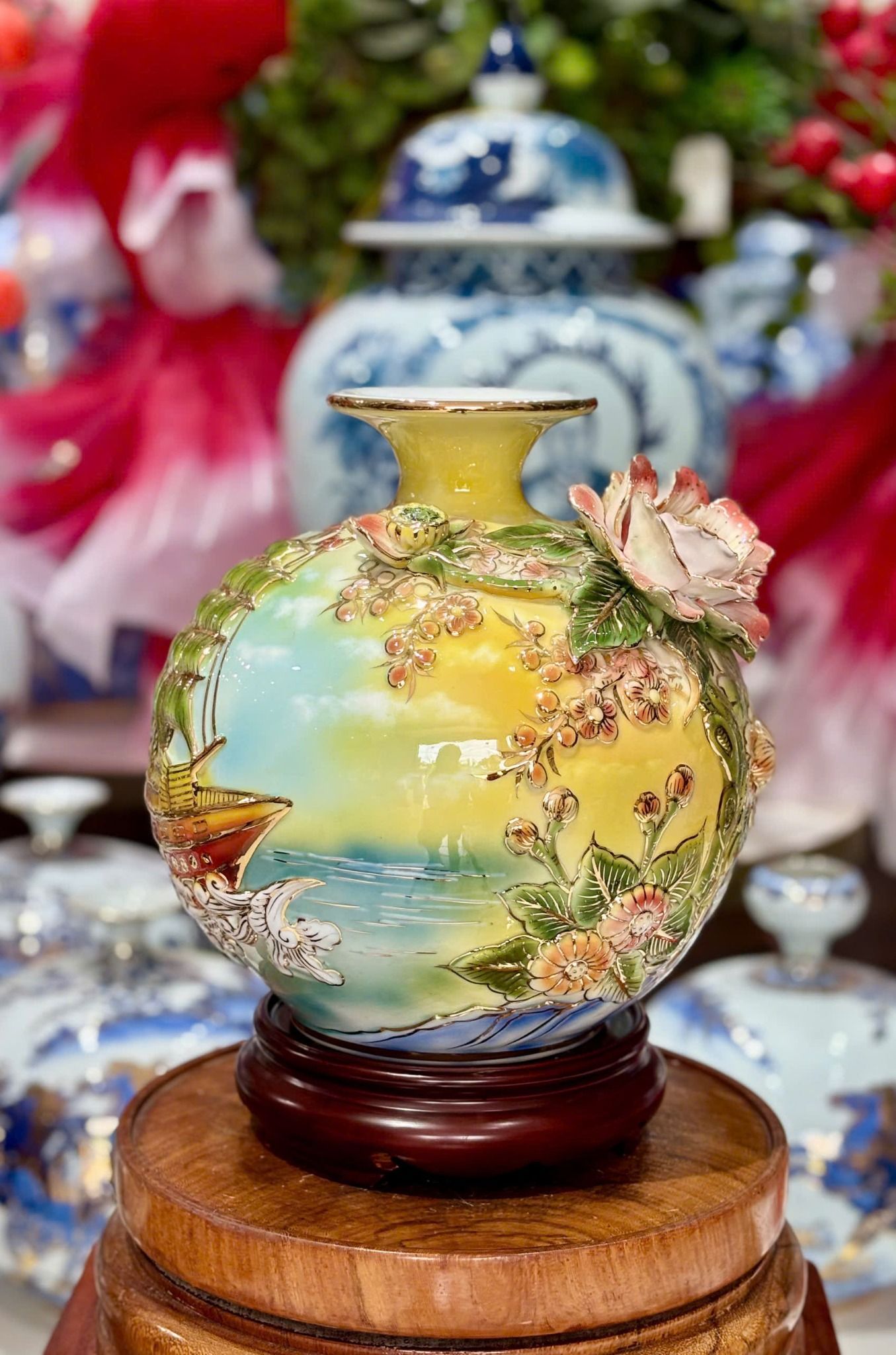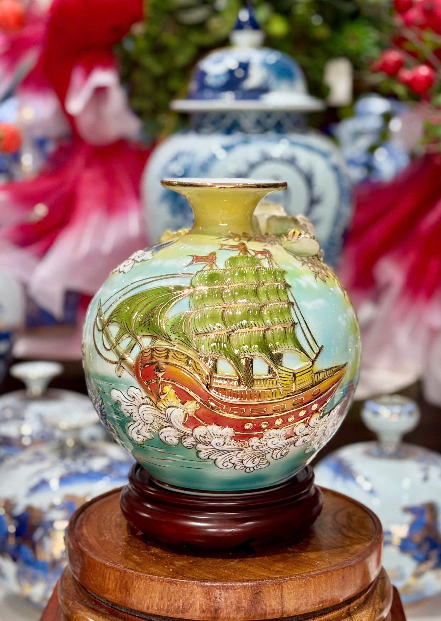 Chế tác thủ công tinh xảo: Bình được chế tác thủ công từ gốm sứ cao cấp, qua nhiều công đoạn tỉ mỉ, từ tạo dáng, nung nhiệt độ cao đến đắp nổi và vẽ tay hoàn thiện. Các chi tiết con thuyền, cánh buồm, sóng nước được đắp nổi nổi bật, tạo cảm giác chuyển động mềm mại, như con thuyền đang vươn mình ra khơi với thuận gió – đón tài – đắc lộc.