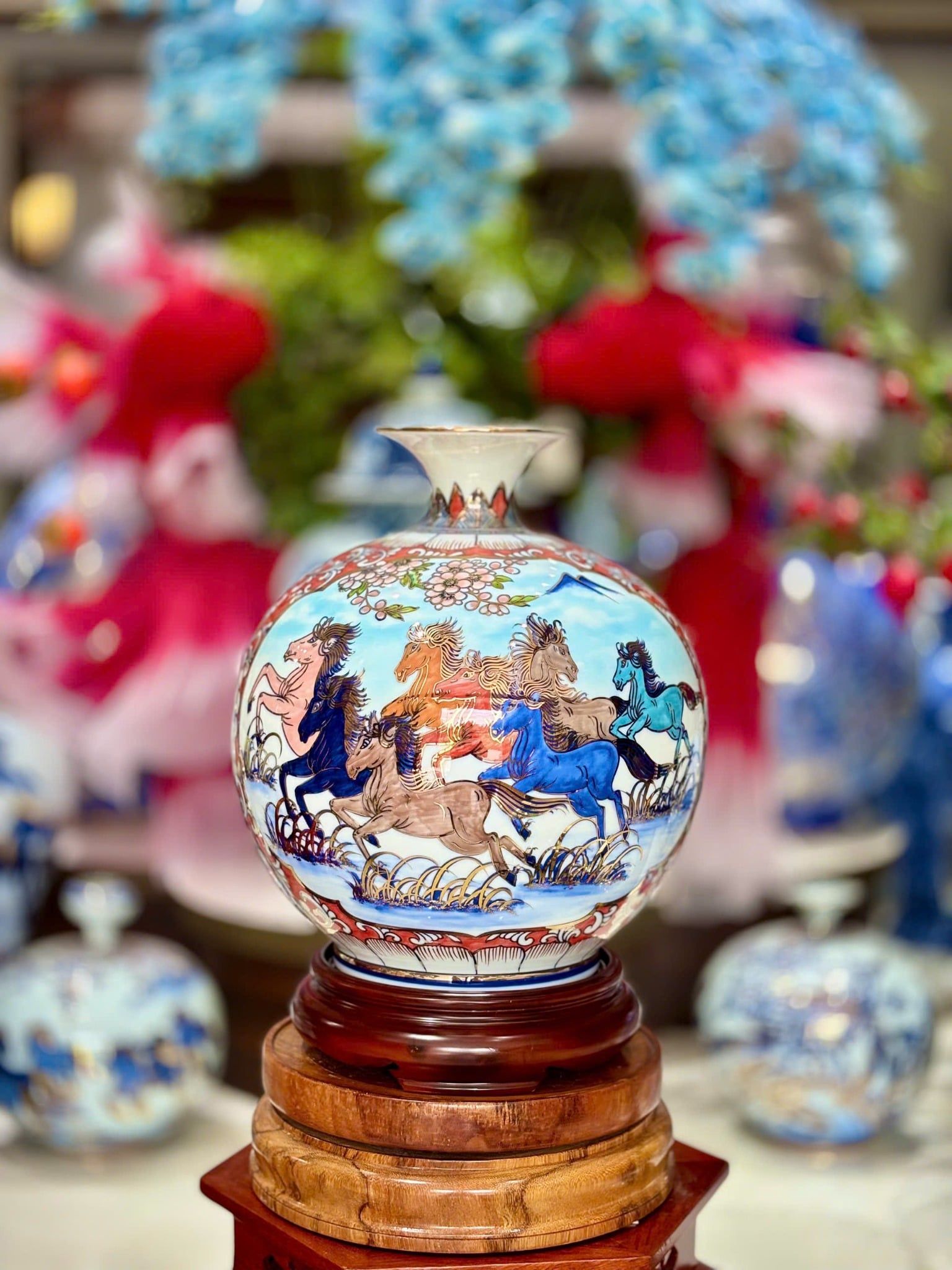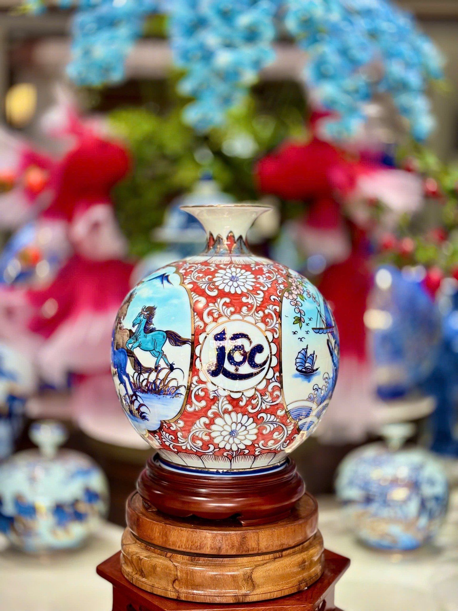 Chiếc bình này là sự kết hợp giữa nghệ thuật gốm sứ truyền thống và các yếu tố phong thủy quan trọng.