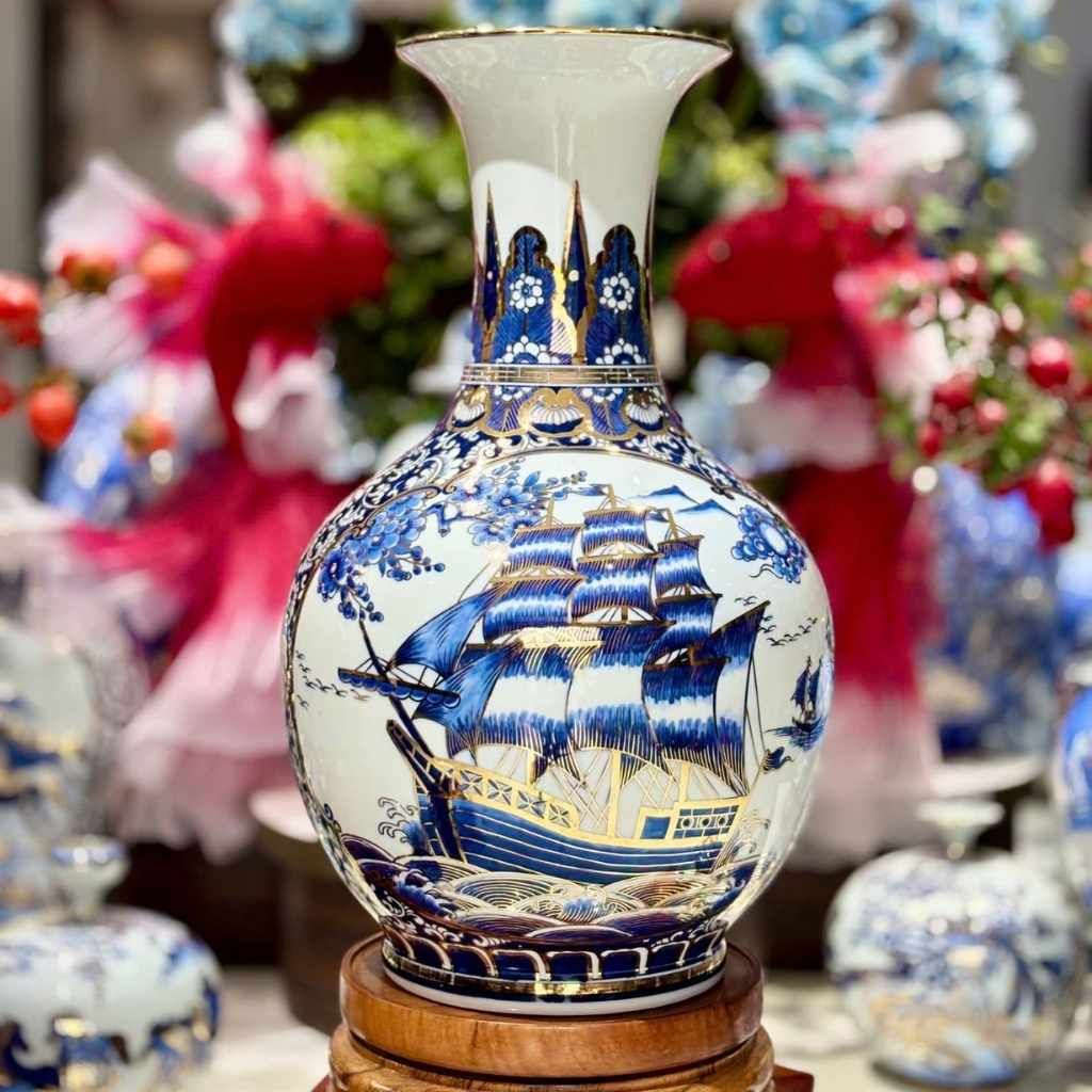 Sản phẩm là sự kết hợp hoàn hảo giữa chất liệu gốm sứ truyền thống, kích thước uy nghi và kỹ thuật vẽ vàng thủ công tinh xảo.
