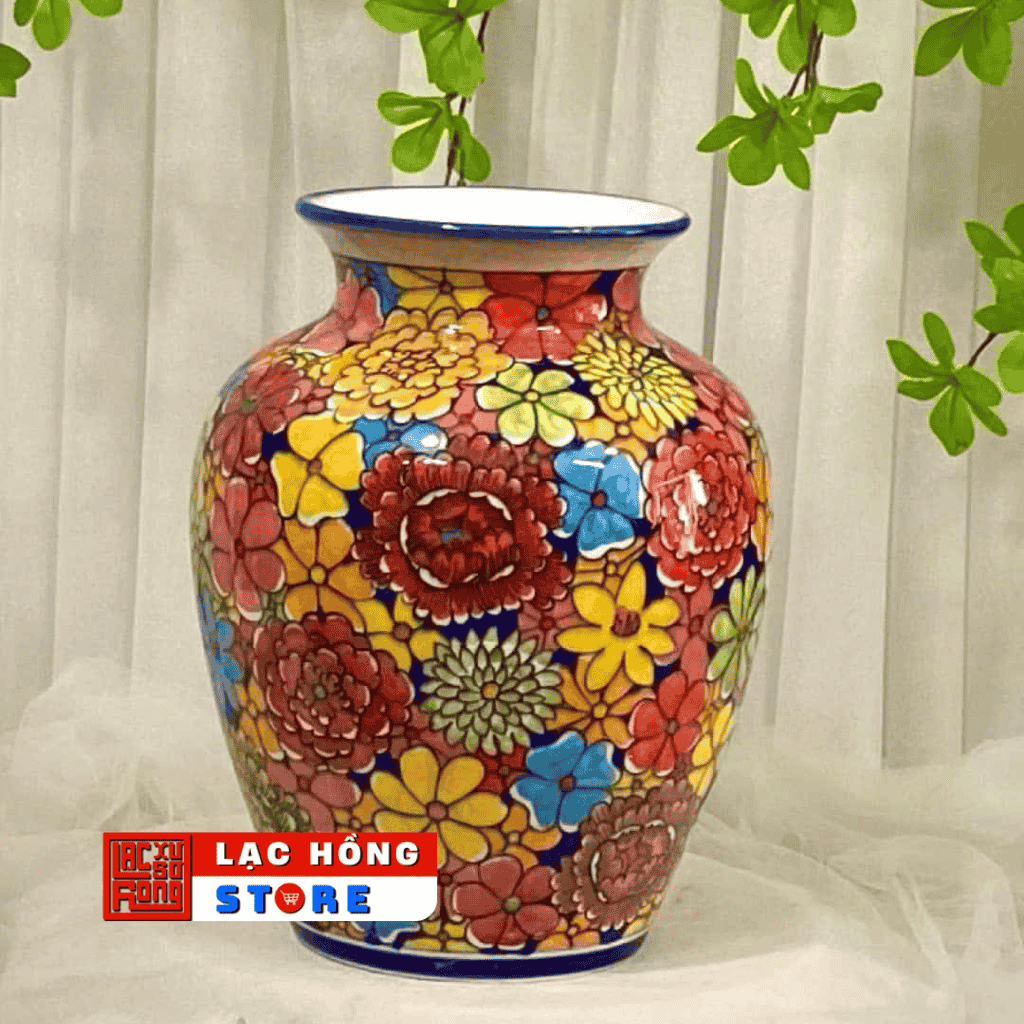 Hoàn thiện tinh tế, màu sắc tươi sáng: Bề mặt bình được phủ lớp men bóng hoặc men mờ chất lượng cao, giúp bảo vệ họa tiết và giữ màu sắc luôn tươi mới, không phai nhạt theo thời gian. Màu sắc của hoa được pha trộn hài hòa, tạo hiệu ứng thị giác ấn tượng, làm bừng sáng mọi góc nhìn.
